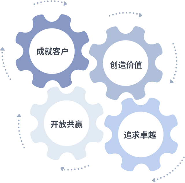 成就客户是一切决策的出发点,,创造价值是衡量所有工作的标准,,,,追求卓越是我们做事做人的态度,,开放共赢是我们的格局也是最终的结果。。价值观的齿轮环环相扣,,,推动着组织里的每个人不断向前。。